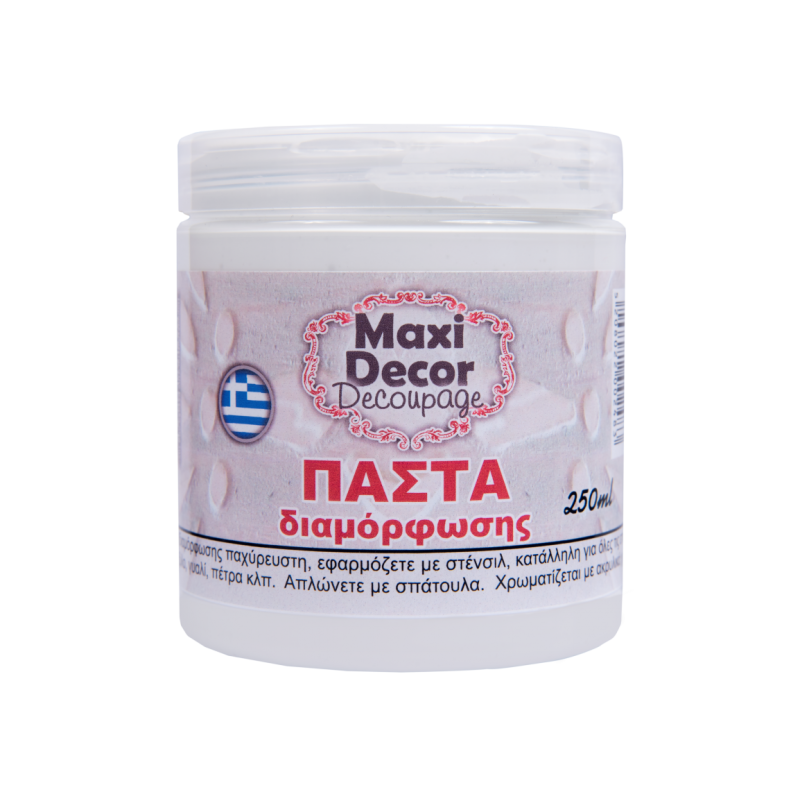 Η ειδική σύνθεση της Πάστας Διαμόρφωσης βοηθάει ώστε να εφαρμόζεται με χαρακτηριστική ευκολία. Απλώνει θαυμάσια και σας διευκολύνει να πετύχετε με μεγαλύτερη λεπτομέρεια το αποτέλεσμα που επιθυμείτε. Μπορεί να εφαρμοστεί με stencil και να χρωματιστεί με τα Ακρυλικά χρώματα και τα Color Spray.