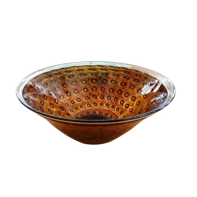 Μπωλ γυάλινο στρογγυλό καφέ με καφέ βούλες.Βάση διάμετρος 10 εκ .Διάσταση φ 27 x 12 εκ ύψος